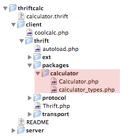 In this example, I’ve moved the source php library files into a folder called “thrift” in my php root application folder, and I’ve moved the auto generated files from the previous step into the packages folder. Note that the package folder “calculator” was autogenerated based off the file name of the thrift file, this will also be reflected in *thriftname*_types.php.